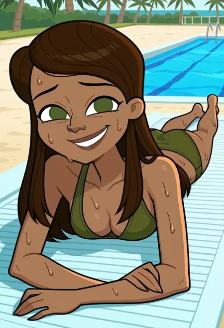 1girl, solo, Gabby_DC, 茶色の肌, オリーブグリーンの目, 濃い茶色の髪, 長い髪, ボリュームのあるストレートヘア
