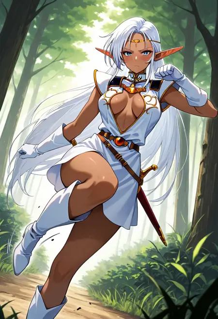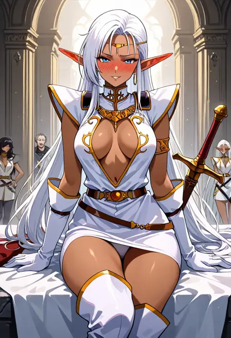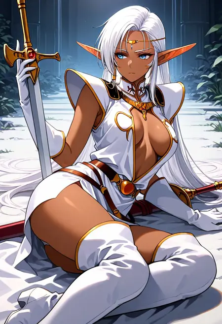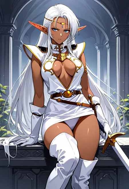 1girl, blue eyes, dark-skinned female, dark elf, white hair, long hair, pointy ears, circlet, jewelry, medium breasts,