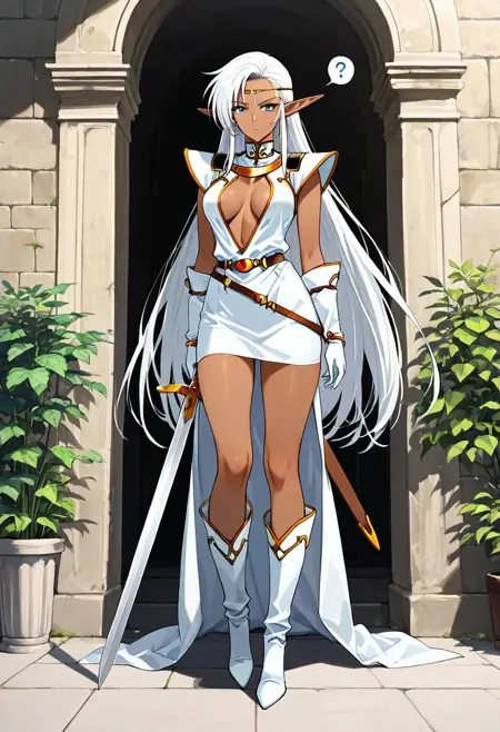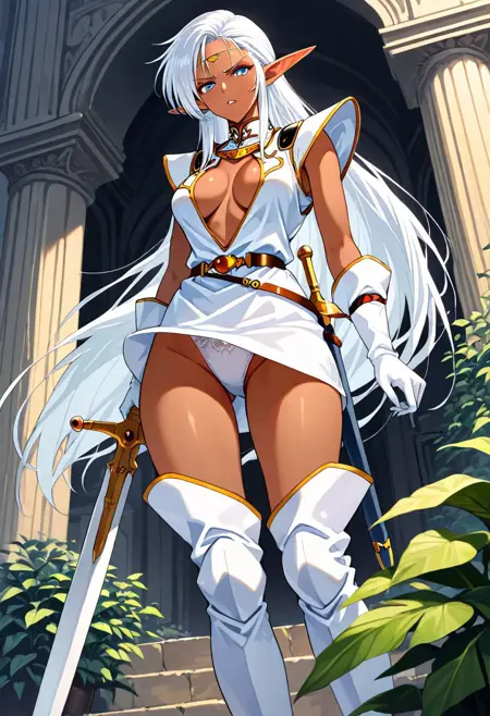 thigh white boots, belt, white boots, short white dress, sleeveless dress, breasts apart, white hair, white panties, cleavage, white elbow gloves, plunging neckline, navel, scabbard, sword,