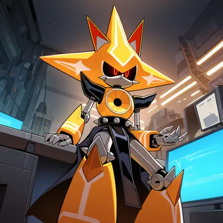 SNMS, red eyes, colored sclera, robot, yellow mecha, waist cape, spikes, fake animal ears, black sclera, robot joints, humanoid robot,