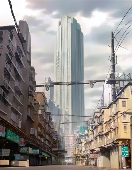 city, building, scenery, tokyo \(city\), cityscape, outdoors, real world location, sky, cloud, skyscraper, street, road, power lines, cloudy sky, (anime screencap)