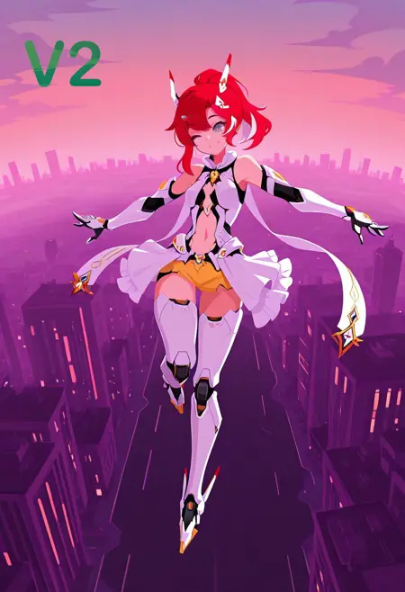 1girl, eikpos, 빨간 머리, 흰색 스트라이프, 포니테일, 한쪽 머리카락, 회색 눈, 붉은 동공, 머리클립, 헤드기어, 소매 없는 드레스, 흰색 드레스, 배꼽, 중앙 개구부, 복부 절개, 노란색 반바지, 짧은 반바지, 쇼걸 스커트, 흰색 스커트, 프릴이 달린 스커트, 기계식 다리, 기계식 하의, 흰색 스톨, 어깨 노출, 기계식 팔뚝 장갑, 기계식 장갑, 팔꿈치 장갑, 갑옷, 기계식 신발,