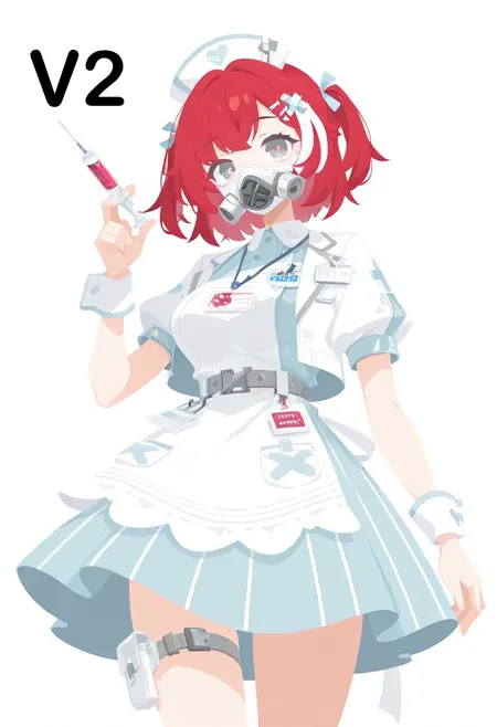 1girl, eiksb, 가스 마스크, 흰색 마스크, 빨간 머리, 흰색 스트라이프, 양쪽 위로 올린 헤어스타일, 연청색 리본, 하트 프린트, 입 가린 상태, 머리 리본, 회색 눈, 붉은 동공, 회색 머리클립, 간호사 모자, 흰색 머리장식, 칼라 드레스, 흰색 칼라, 연청색 드레스, 흰색 앞치마, 간호사, 칼라 재킷, 열린 재킷, 흰색 재킷, 짧은 재킷, 푸석푸석한 짧은 소매, 흰색 소매, 연청색 소매 끝, 흰색 손목 장식, 란야드, 아이카드, 회색 벨트, 줄무늬 스커트, 연청색 스커트, 허벅지 주머니,