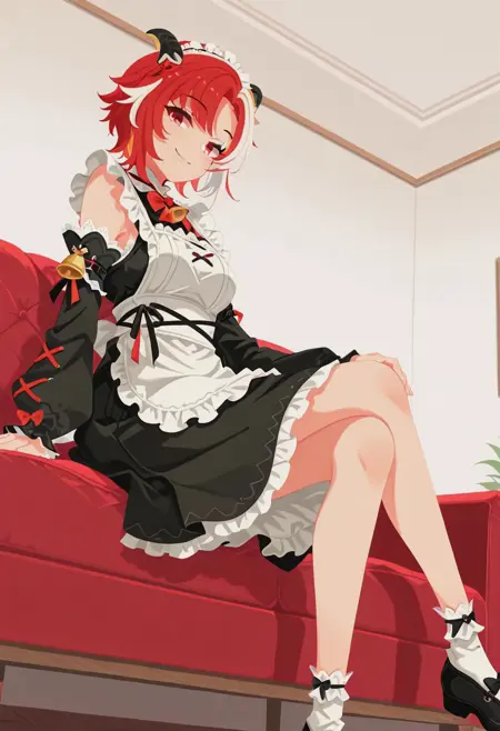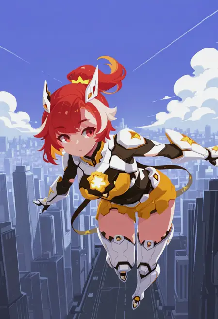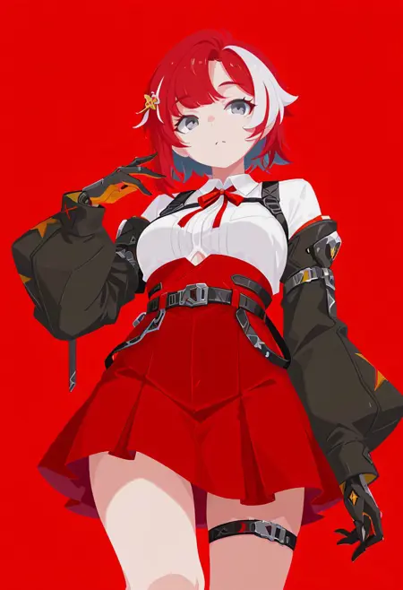 1girl, eikpos, red hair, white streaks, ponytail, single sidelock, grey eyes, red pupils, hairclip, headgear, sleeveless dress, white dress, navel, center opening, stomach cutout, yellow shorts, short shorts, showgirl skirt, white skirt, frilled skirt, mechanical legs, mechanical legwear, white stole, bare shoulders, mechanical gauntlets, mechanical gloves, elbow gloves, armor, mechanical footwear,