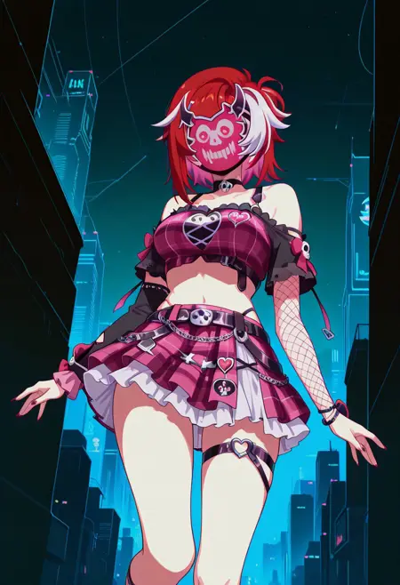 1girl, eikams, covered face, red hair, white streaks, rabbit mask, Xd, white mask, face print, rabbit hair ornament, magenta crop top, shoulder straps, o-ring choker, black choker, cleavage, cross-laced shirt, plaid shirt, black underbust, pink ribbon, magenta skirt, layered skirt, studded belt, black belt, heart buckle, panty straps, midriff, navel, frills, plaid skirt, frilled skirt, white underskirt, black thigh pouch, fur wrist cuffs, fishnet armwear, asymmetrical armwear, arm bow, black bow,