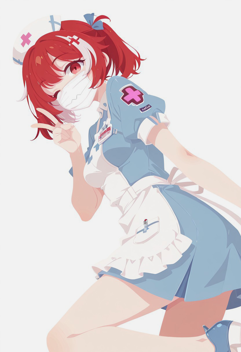 1girl, eiksb, gas mask, white mask, red hair, white streaks, two side up, light blue ribbon, heart print, covered mouth, hair ribbon, grey eyes, red pupils, grey hairclip, nurse cap, white headwear, collared dress, white collar, light blue dress, white apron, nurse, collared jacket, open jacket, white jacket, cropped jacket, puffy short sleeves, white sleeves, light blue sleeve cuffs, white wrist cuffs, lanyard, id card, grey belt, striped skirt, light blue skirt, thigh pouch,