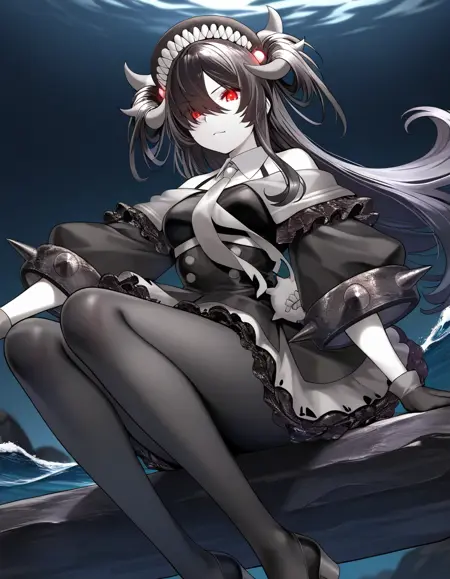 デフォルトの衣装:黒いドレス、肩出し、白いカラー、グレーのネクタイ、トーンクラッシュ、広い袖、スパイク付き袖、フリル付きドレス、黒いフリル、黒いパンティーハイズ、黒いブーツ、膝上ブーツ、スパイク付きブーツ、黒い手袋、錆びたスパイク