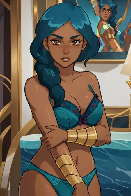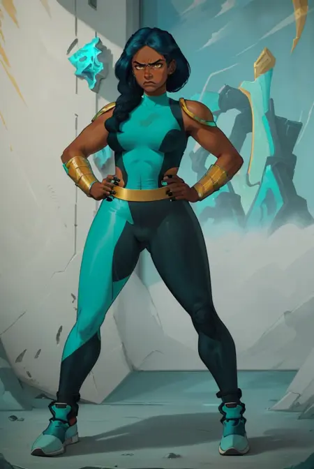 衣装用:<lora:mermistav118:0.7>(mermista, single braid, dark-skinned female, paldrons, bracer, armor, pants)