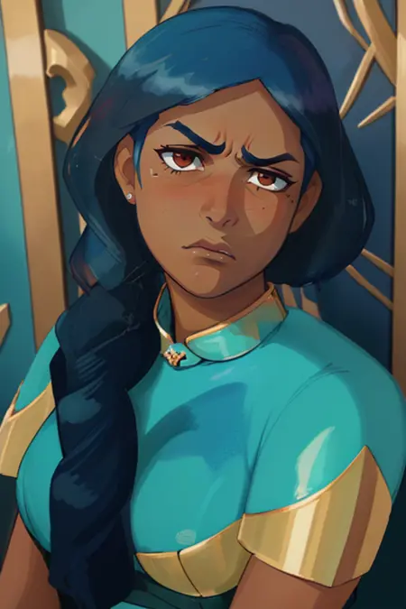 Simple prompt: lora:mermistav118:0.7(mermista, single braid, dark-skinned female)