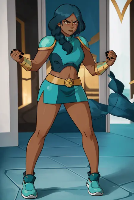 For her clothes: lora:mermistav118:0.7(mermista, single braid, dark-skinned female, paldrons, bracer, armor, pants)