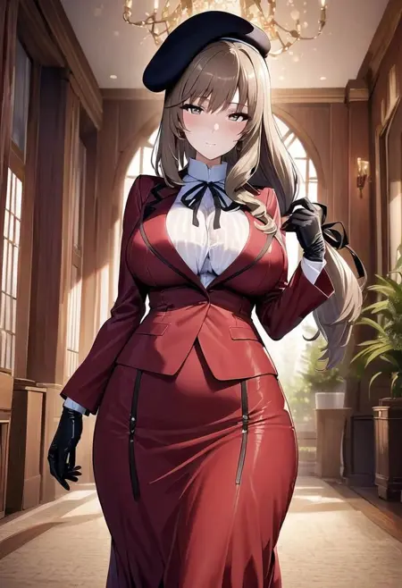 触发词:chiyo_a, milf, 长发, 低扎长发, 刘海, 大胸, 贝雷帽, 黑色头饰, 红色夹克, 颈部丝带, 高领, 衬衫, 长袖, 黑色手套, 长裙, 红色裙子, 靴子, 黑色鞋履,