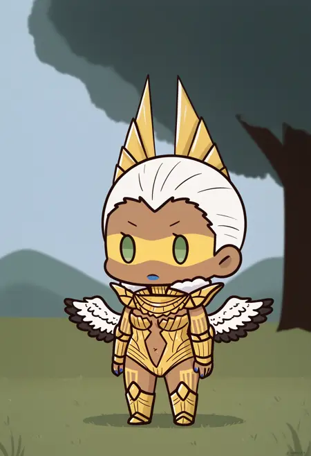 기본 외모: abdiel, 흰색 머리카락, 짧은 머리, 뒤로 젖힌 머리카락, 녹색 눈, 녹색 공막, 검은 피부를 가진 여성, 안대, 파란 입술, 머리 장식, 금색 갑옷, 목보호대, 털 장식이 있는 칼라, 흉부 노출, 중앙 개방부, 배꼽, 팔보호대, 파란 손톱, 몸 문신, 갑옷 부츠, 금색 신발, 깃털 날개