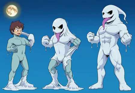 goo transformation, transformation, goo-connected lips, goo creature, one row layout, sequence, transformation sequence,
