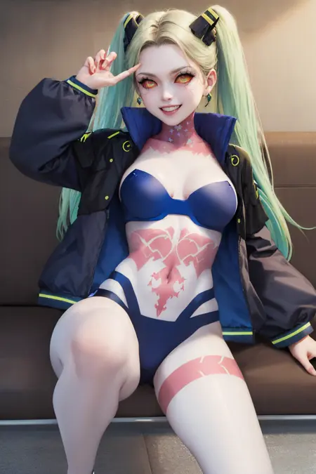 트리거 + 외모: cprebecca, 컬러링된 피부, 흰 피부, 녹색 머리카락, 더블 테일, 인공 눈, 컬러링된 공막, 빨간 공막