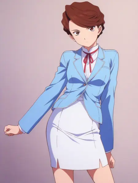 일상복: 목 립본, 파란 재킷, 흰 치마,