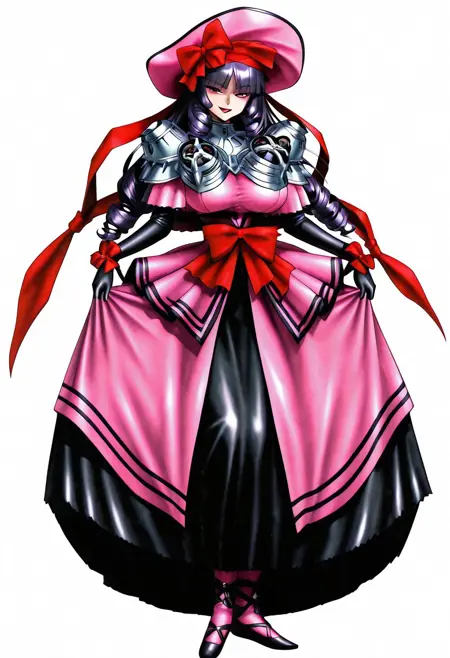 TAGS : pink headwear,mob cap,hat,neck armor,capelet, dress,pink dress,red ribbon,bow,armor,elbow gloves,pink skirt,red bow,black long skirt,pink long skirt,frill,abdomen bow,