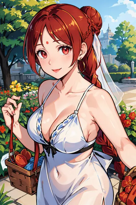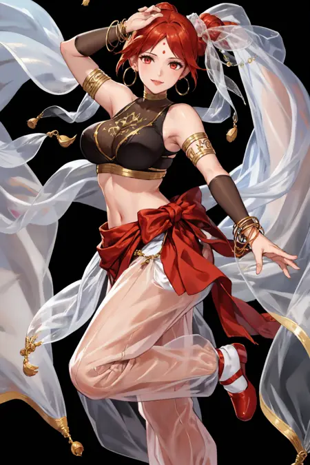 Add "forehead mark, earrings, bracelet, crop top, armlet, vambraces, see-through, harem pants" for her typical look.