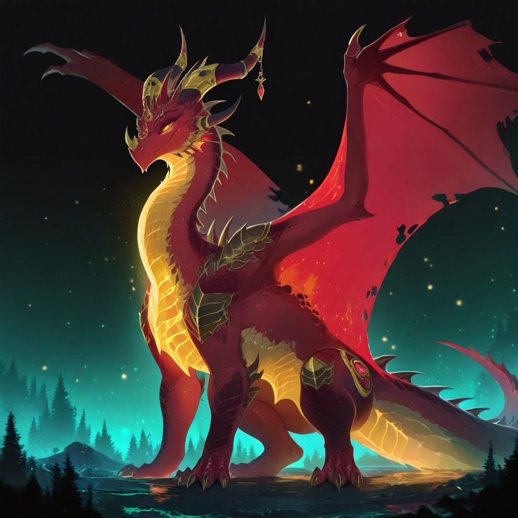 1girl, Alexstrasza, feral, dragon, wings, tail, scalie, scales, red eyes, yellow eyes, chubby body, wide hips, big thighs, big ass, dragon horns, jewelry