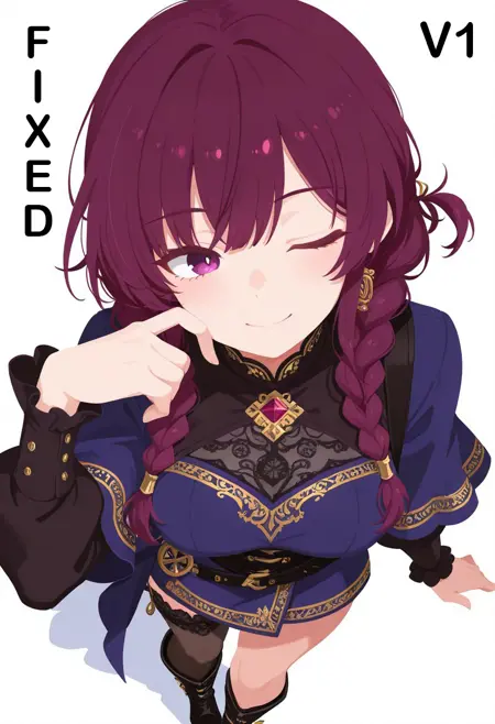 1girl, leo3, long dark magenta hair in twin braids, a stylish Asian-inspired modern outfit, red half side of shirt, ornate gold embroidery, a short blue tunic with a belt, one thigh-high black stocking, black heeled boots, corset,