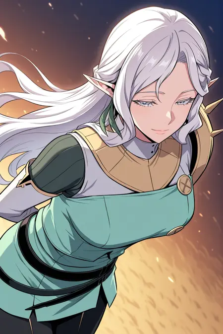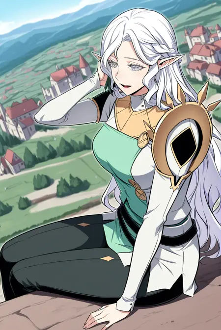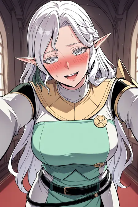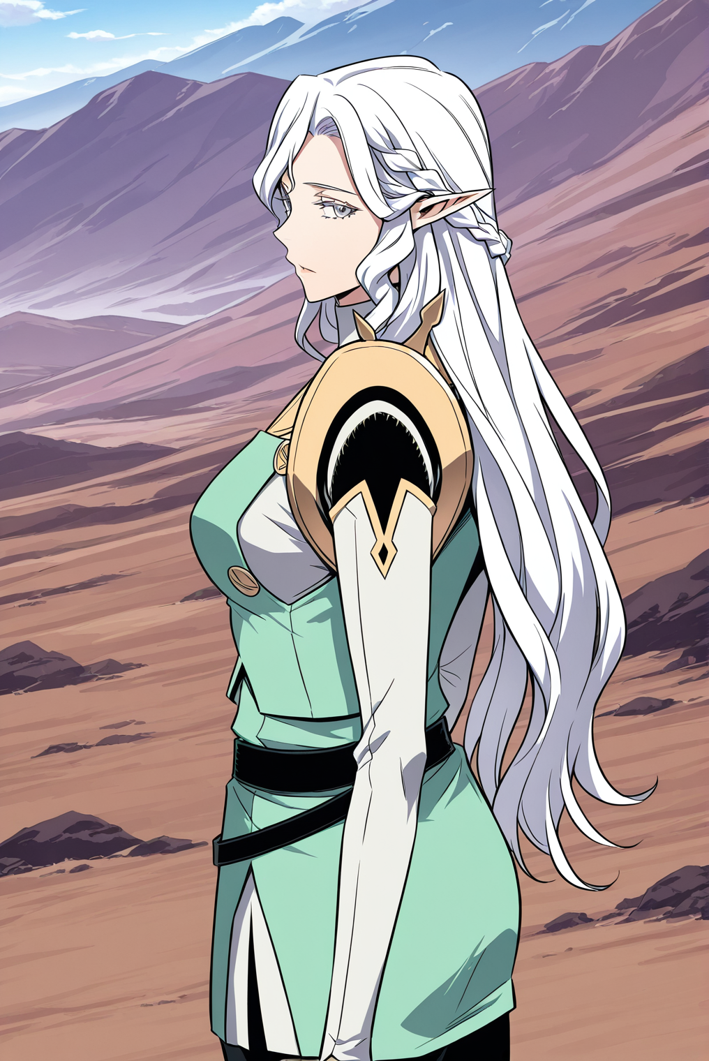 Snow, 1 girl, solo, silver eyes, elf, long hair, white hair, wavy hair, side braid, side bangs, side hair, pointed ears,