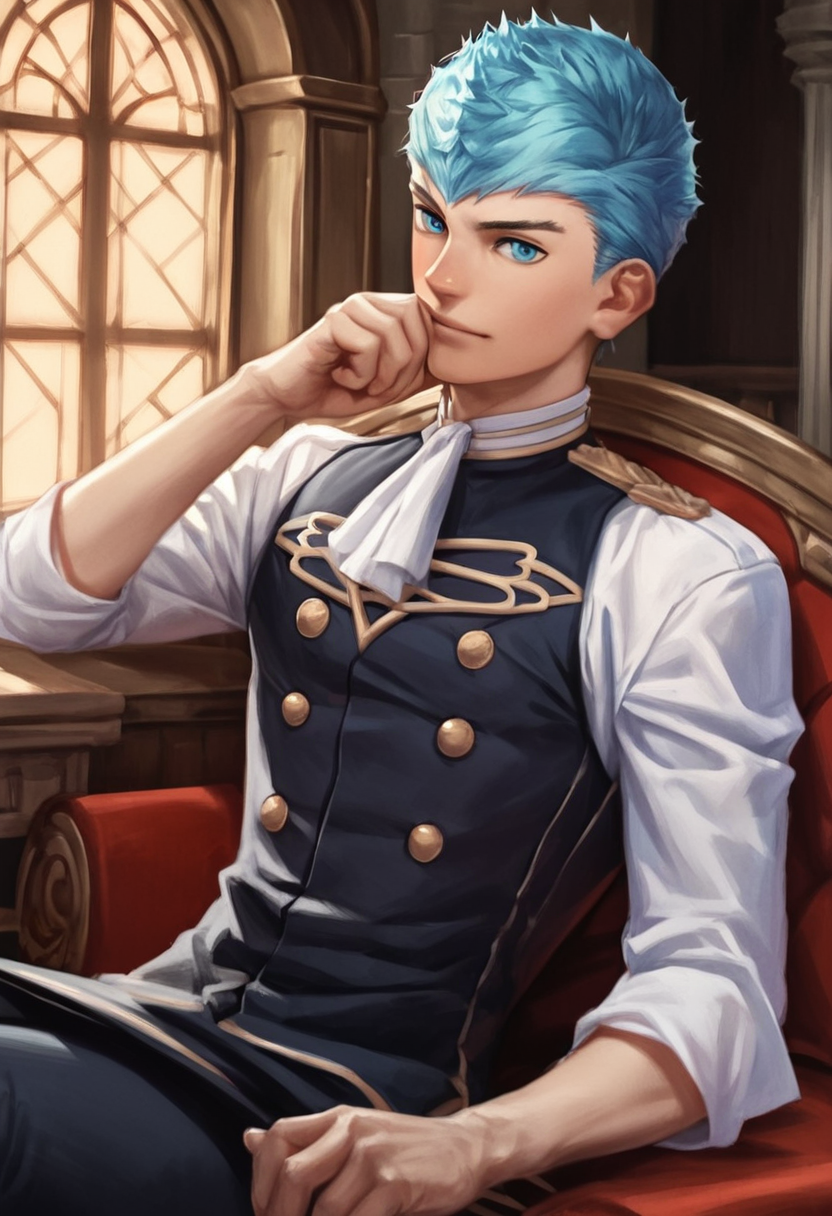 caspar, male focus, blue eyes, blue hair, short hair