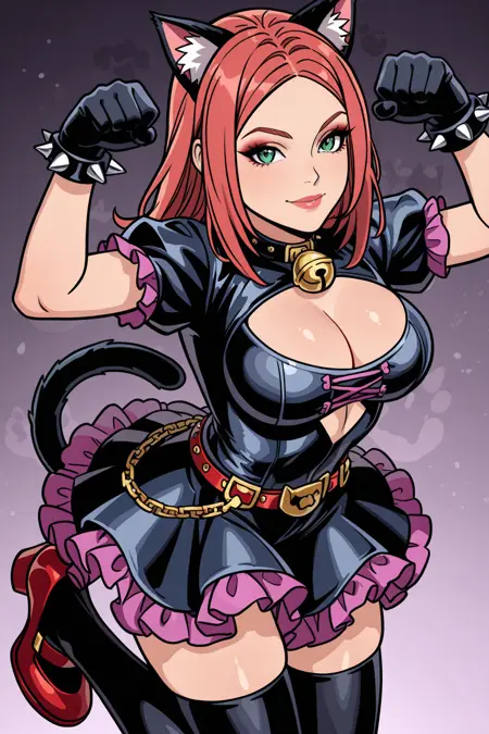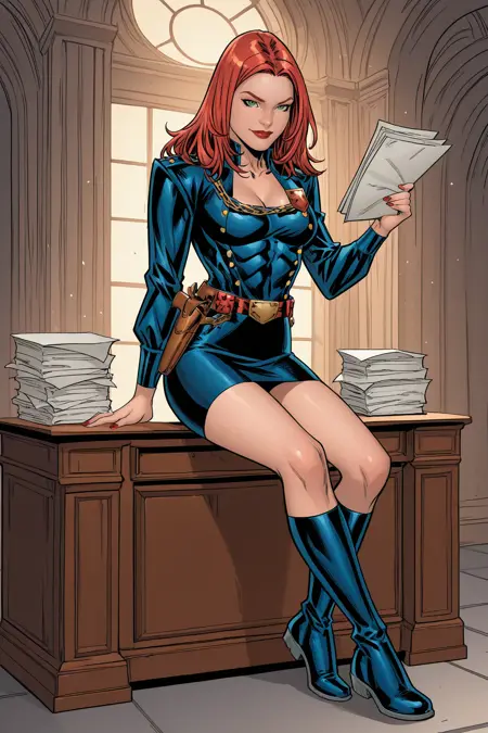 트리거 경찰: icaria, 긴 머리, 녹색 눈, 메이크업, 유니폼, 체인, 벨트, 네일 폴리시, 미니스커트, 총ケース, 무릎 부츠