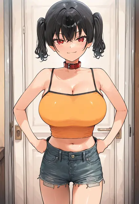 1. ((pink choker collar, yellow camisole with black edge, obscene cleavage, huge cleavage, midriff, denim shorts, )) red hair ties, pink sandal,