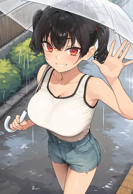 6. ((red choker collar, yellow camisole with black edge, obscene cleavage, huge cleavage, midriff, denim shorts, )) white socks, white shoes, red backpack, blue water bottle,