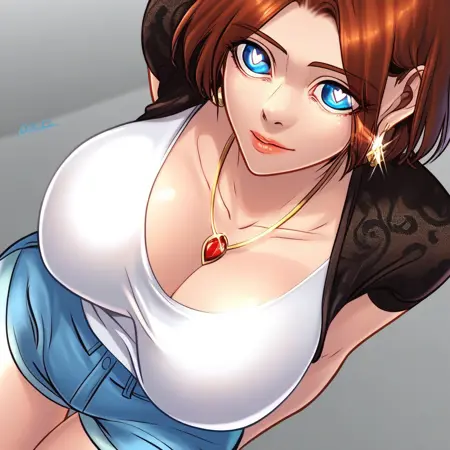 1. ((性感透明黑色蕾丝短开衫,性感挖空白色背心,露骨胸脯,巨大胸脯,牛仔短裤,)) 金色宝石吊坠项链,宝石耳环,