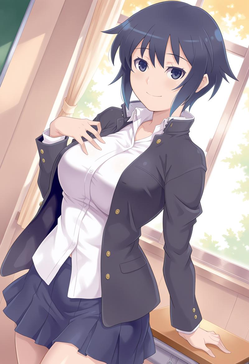 옷: 재킷, 긴 소매, 흰색 셔츠, 파란색 짧은 치마,