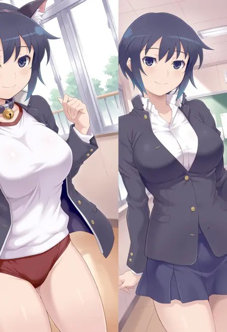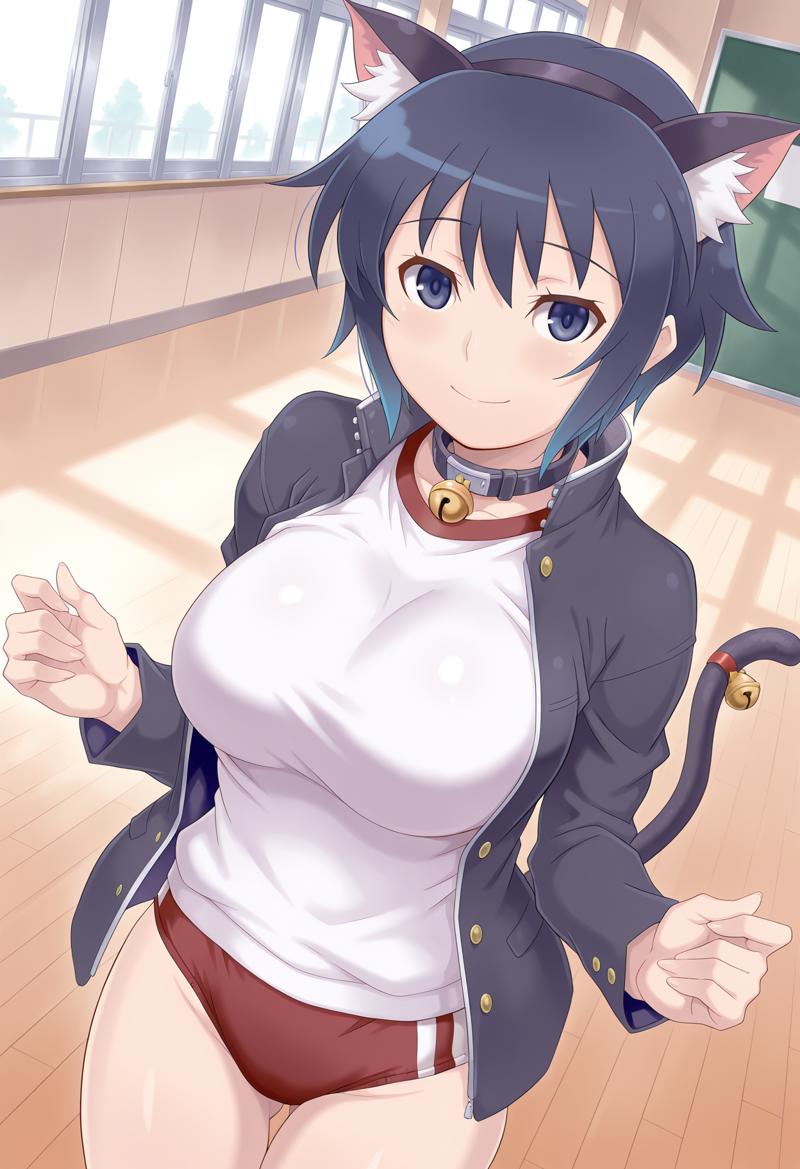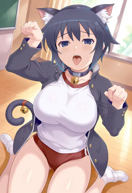 옷: 재킷, 긴 소매, 동물 귀, 고양이 귀, 체육복 상의, 빨간 부루마, 열린 옷, 열린 재킷, 고양이 꼬리, 목걸이, 꼬리 종,