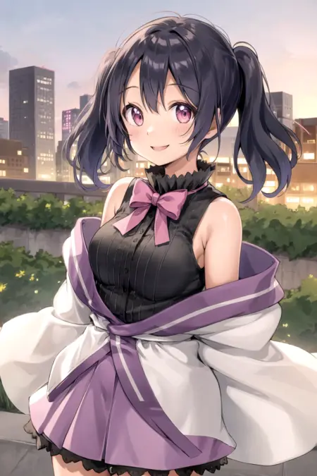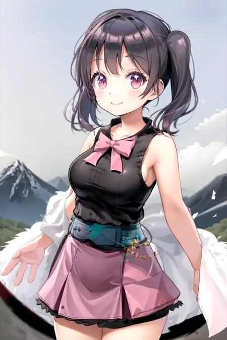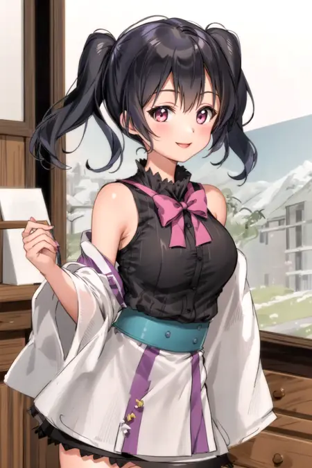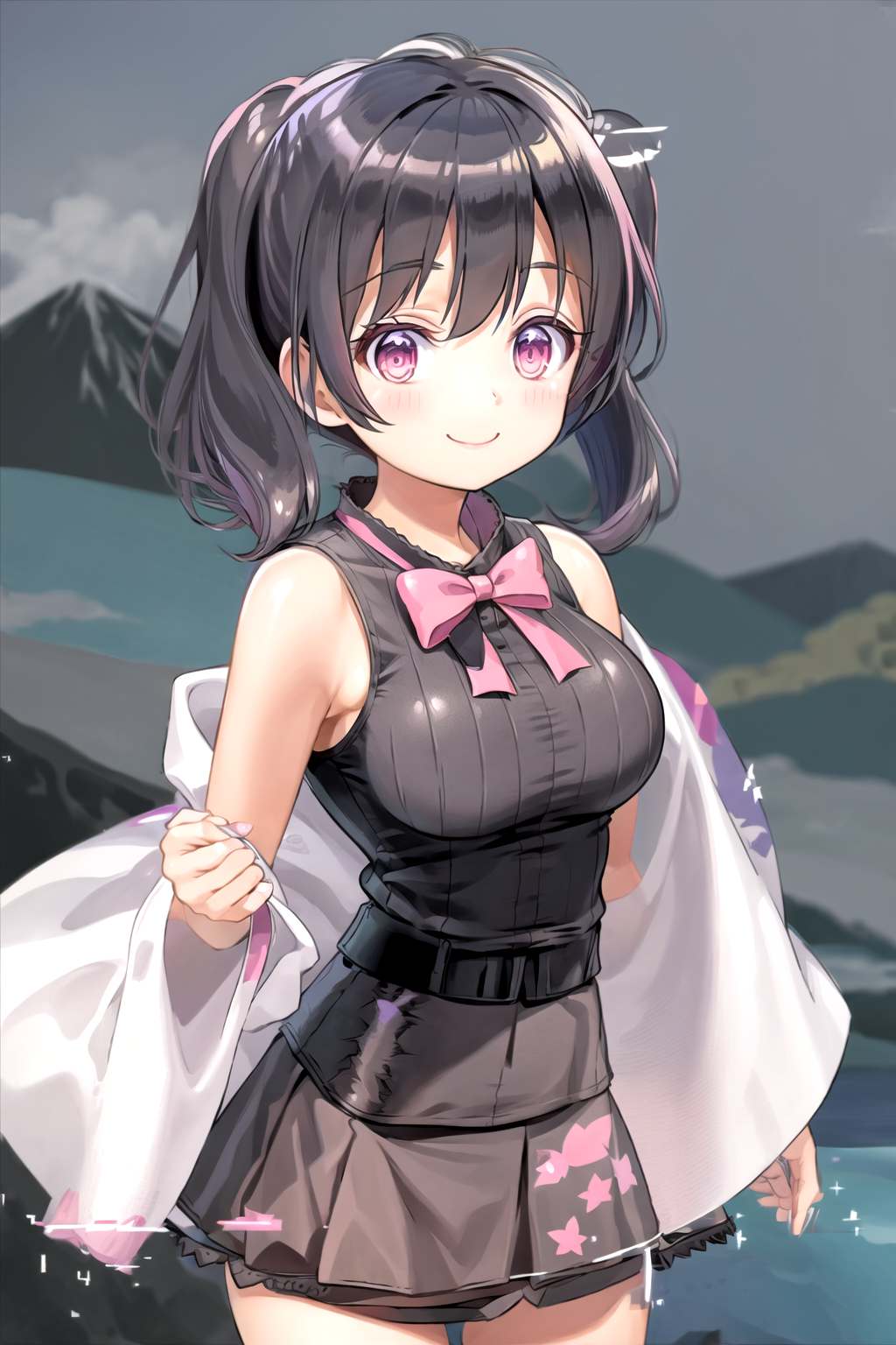 yukimi koume, 无袖上衣, 中等胸部, 露肩, 短和服, 白色和服, 双马尾, 粉色眼睛, 黑发, 裙子, 黑色上衣