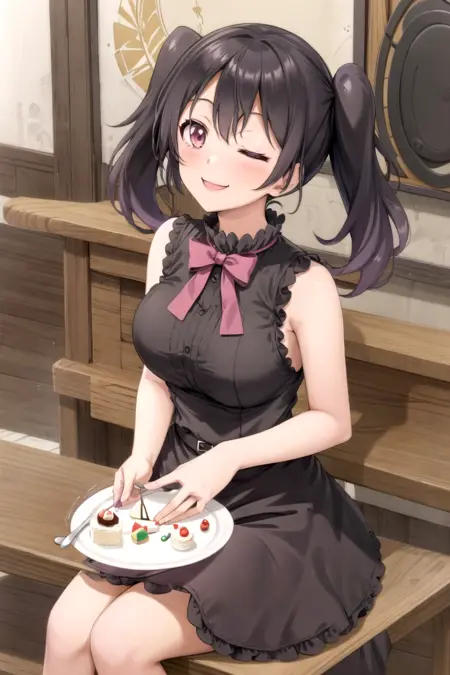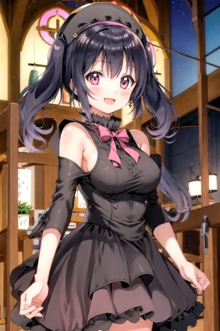 yukimi koume, 无袖连衣裙, 中等胸部, 女巫帽, 双马尾, 粉色眼睛, 黑发, 黑色连衣裙