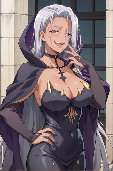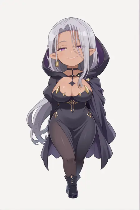dark elf, dark-skinned female, very long hair, grey hair, purple eyes, large breasts