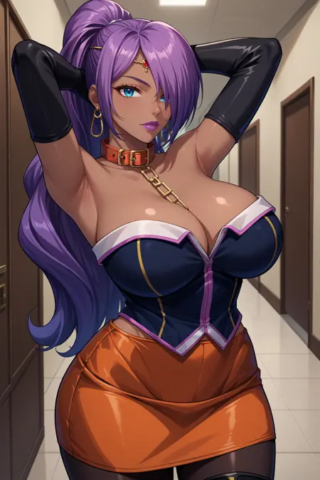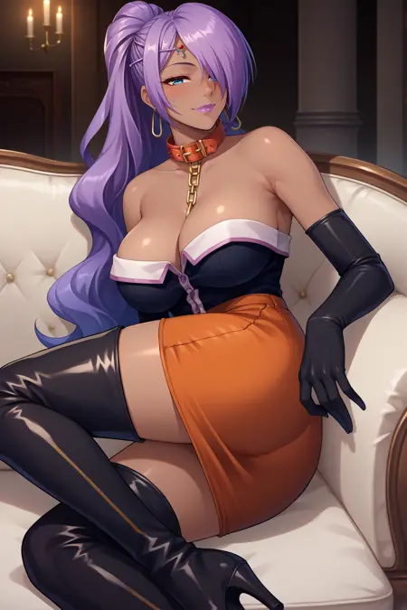 为呈现她的典型造型,请添加 "耳环,头冠,红色项圈,黑色上衣,无肩带上衣,胸部显露,肘部手套,黑色手套,橙色裙子,黑色大腿靴"。