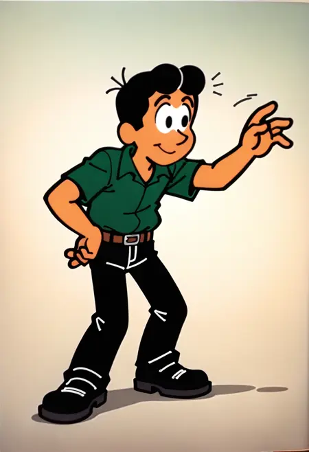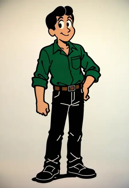SeuCarlosTDM, 1boy, green shirt, black pants, brown belt, cartoon style, simple black hair, black eyes, black shoes, cartoonish, cartoon style, cartoon, 2d, digital art, 2d art,