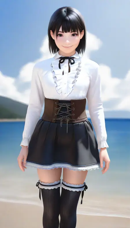 chisatoshinjo, realistic, 1girl, solo, black hair, short hair, bangs, brown eyes, beauty mark, white long-sleeve blouse with ruffles, black ribbon tied at neck, black skirt with corset lace-up waist, black knee-high socks with white lace trim and black bows,