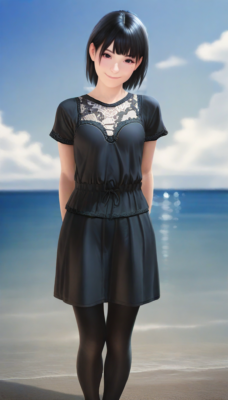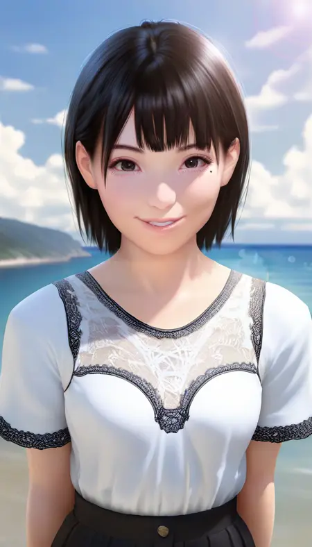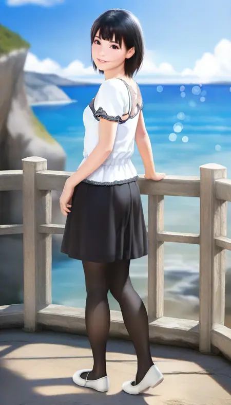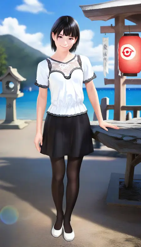 hisatoshinjo, realistic, 1girl, solo, black hair, short hair, bangs, brown eyes, beauty mark, white blouse with lace details, black skirt, black pantyhose, white flat shoes,