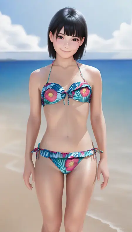 chisatoshinjo, realistic, 1girl, solo, black hair, short hair, bangs, brown eyes, beauty mark, blue floral bikini, bikini ribbon,