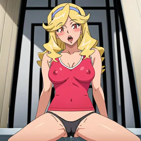 Trigger : Honey, blonde hair, long hair, 1girl, medium breasts, navel, lipstick, hairband, cleavage, short shorts, midriff, front-tie top, makeup, choker, red eyes, groin, lips