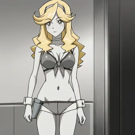 Trigger with grey scaled look: HoneyGreyscaled, 1girl, blonde hair, long hair, hairband, short shorts, navel, wrist cuffs, underwear, grey panties, breasts, grey eyes, grey bra, swimsuit, bikini, cowboy shot