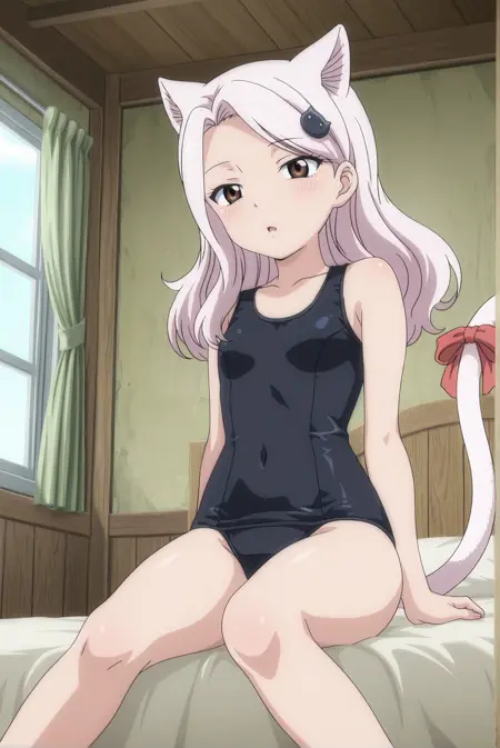 Swimsuit: carla-ne, carla-swimsuit, 1girl, brown eyes, white hair, long hair, animal ears, cat ears, hair ornament, tail, cat tail, cat girl, ribbon, tail ribbon, swimsuit, one-piece swimsuit, school swimsuit, black swimsuit