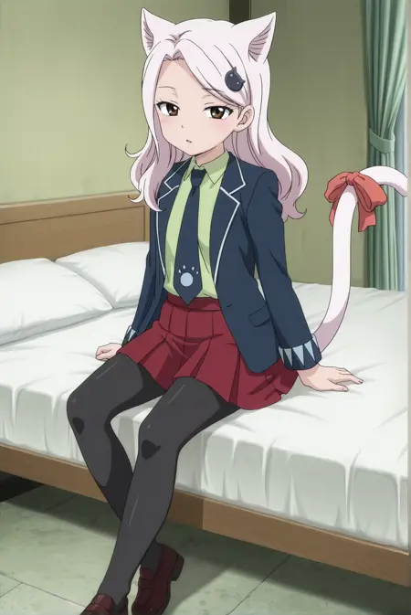 Uniform: carla-ne, carla-uniform, 1girl, brown eyes, white hair, long hair, animal ears, cat ears, hair ornament, tail, cat tail, cat girl, ribbon, tail ribbon, skirt, jacket, necktie, shirt, red skirt, black pantyhose, pantyhose, shoes, collared shirt