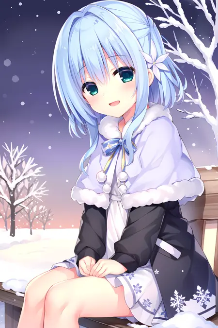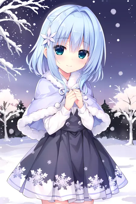 lora:锦亚澄:0.8((masterpiece:1.4, best quality)),1girl,(asumi\(common\):1.3),(short hair),white capelet,dress,snowflake print,hair flower,(loli:1.3),outdoor,(snow:1.3),winter,tree,wind,cowboy shot,(happy:1.2),(smile),open mouth,