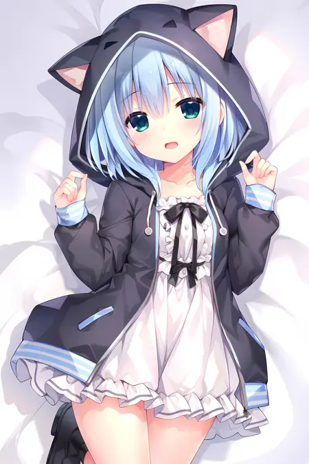 lora:锦亚澄:0.8((masterpiece:1.4, best quality)),1girl,(asumi\(animal hood\):1.3),(short hair),animal hood,hood up,white dress,black ribbon,(loli:1.3),infoor,bed,bedroom,cowboy shot,,(happy),smile,