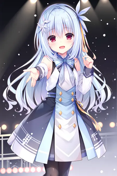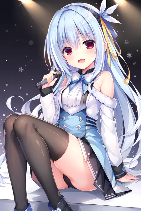 lora:锦亚澄:0.8((masterpiece:1.4, best quality)),1girl,(asumi\(vtb\):1.5),(long hair),blue skirt,(snowflake hair ornament),bare shoulders,,black thighhighs,black footwear,musical note,(loli:1.3),outstretched arm,(stage),(stage lighting),(shiny:1.2),treble clef,singing,(snow:1.2),winter,(happy),smile,open mouth,standing,