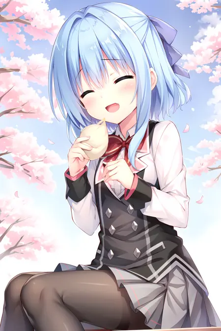 lora:锦亚澄:0.8((masterpiece:1.4, best quality)),1girl,(asumi\(school uniform\):1.3),(short hair),pleated skirt,long sleeves,hair bow,red bow,black pantyhose,(loli:1.3),(baozi),holding food,outdoors,day,cherry blossoms,cherry blossom trees,flying petals,cowboy shot,(happy),open mouth,