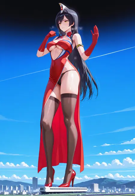 corona_cosmos, black hair, very long hair, headgear, yellow eyes, armband, elbow gloves, dress, cleavage, blue chest jewel, underboob, one-side-waist cutout, medium breasts, single-side slit, panties, tighhighs, red high heels,