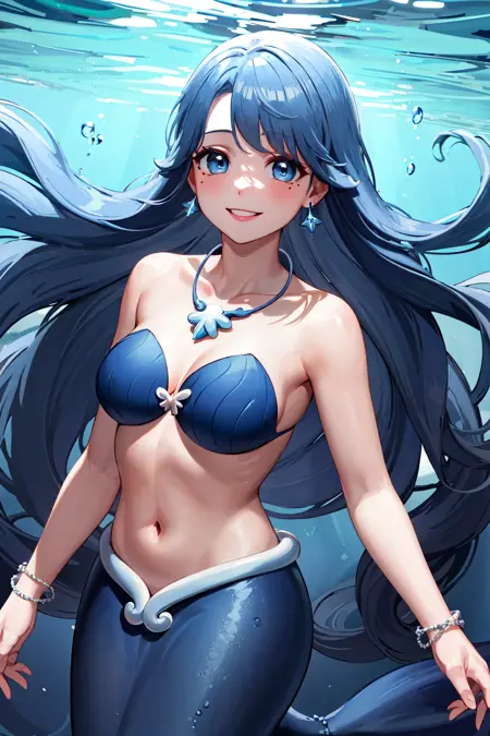 아우트피트21girl, solo, long hair, blue hair, blue eyes, mole under eye, medium breasts, earrings, mermaid, shell necklace, shell bikini, pearl bracelet