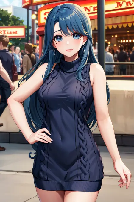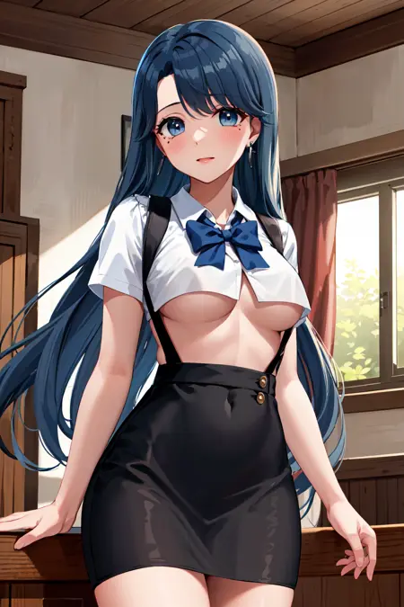 아우트피트11girl, solo, long hair, blue hair, blue eyes, mole under eye, medium breasts, earrings, necklace, bare shoulders, blue dress, strapless dress, white gloves